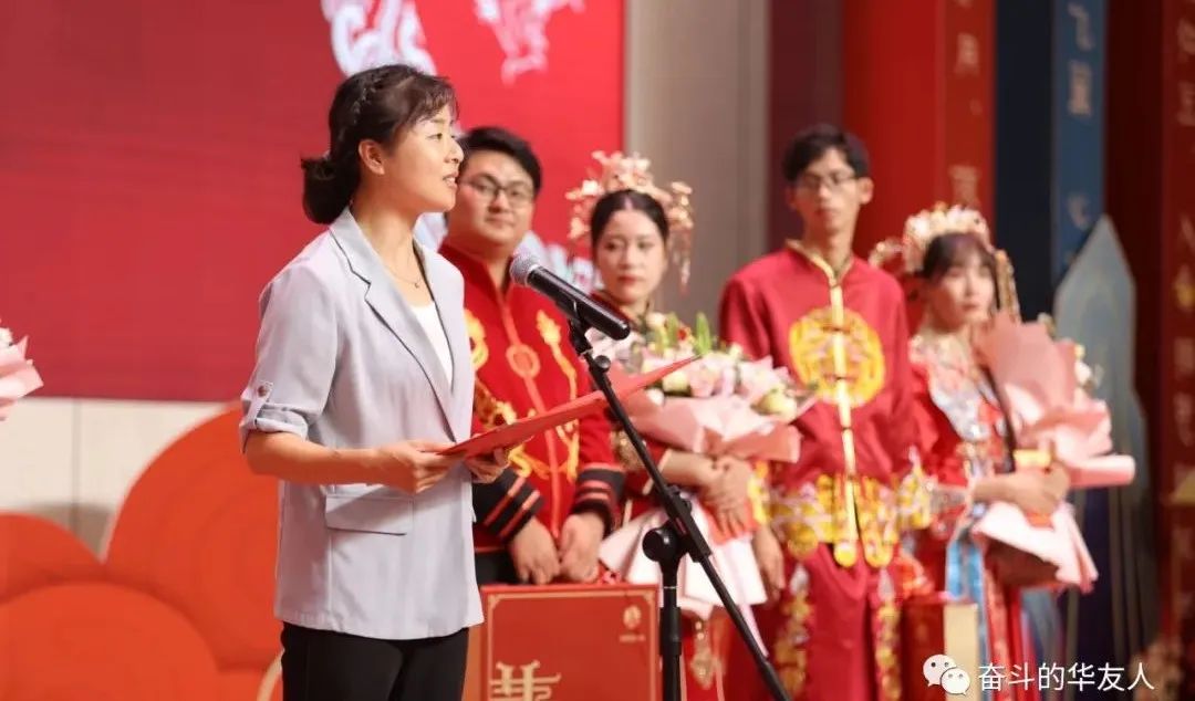 會(huì)場(chǎng)上集團(tuán)副總裁、華友衢州產(chǎn)業(yè)園黨委書(shū)記方圓為新人做了證婚儀式,祝福新人和美一生;集團(tuán)總裁助理、新能源產(chǎn)業(yè)集團(tuán)副總裁李天成為新人送上了鮮花,祝福新人百年好合;集團(tuán)副總裁、新材料產(chǎn)業(yè)集團(tuán)總裁徐偉代表公司為新人送上祝福紅包,祝福新人琴瑟和鳴;華友衢州產(chǎn)業(yè)園工會(huì)主席陸熙明代表工會(huì)為新人送上了賀禮,祝福新人長(zhǎng)長(zhǎng)久久;共青團(tuán)衢州市委書(shū)記童舟致賀詞,祝愿新人恩愛(ài)一生共白頭。