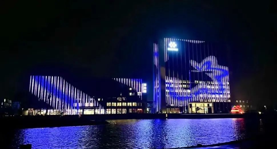 華友湖畔,夜燈長明,在黑夜的襯托下,科創(chuàng)大樓上華友鈷業(yè)的Logo格外明亮。華友的夜燈照亮華友的未來,華友的Logo綻放華友的光華。