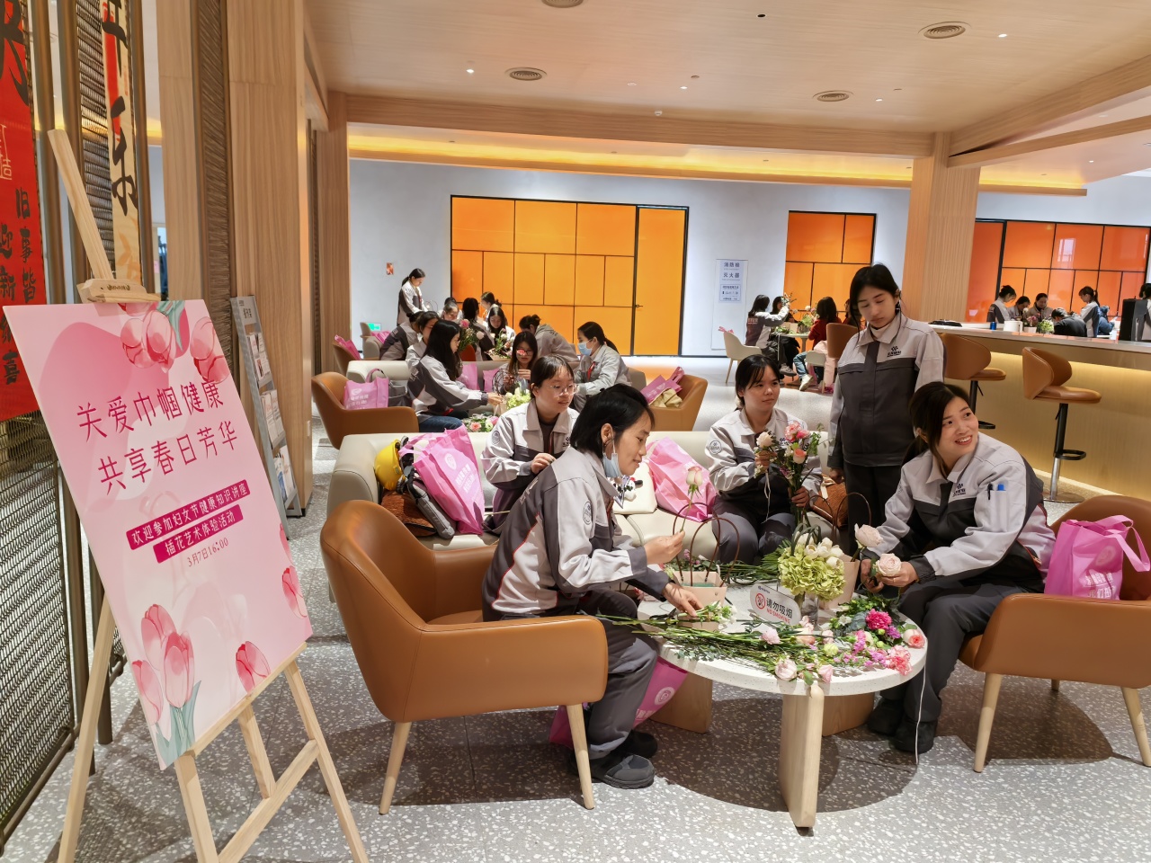 健康講座結(jié)束后,員工們在花藝師指導(dǎo)下進(jìn)行春日主題插花創(chuàng)作。拆開春日花材包的那一刻,商超休閑中心化作花香彌漫的創(chuàng)作空間??的塑暗臏厝帷⒀蠼酃5撵`動、尤加利葉的堅(jiān)韌…… 每一束花籃都是職場女性多重角色的生動寫照。