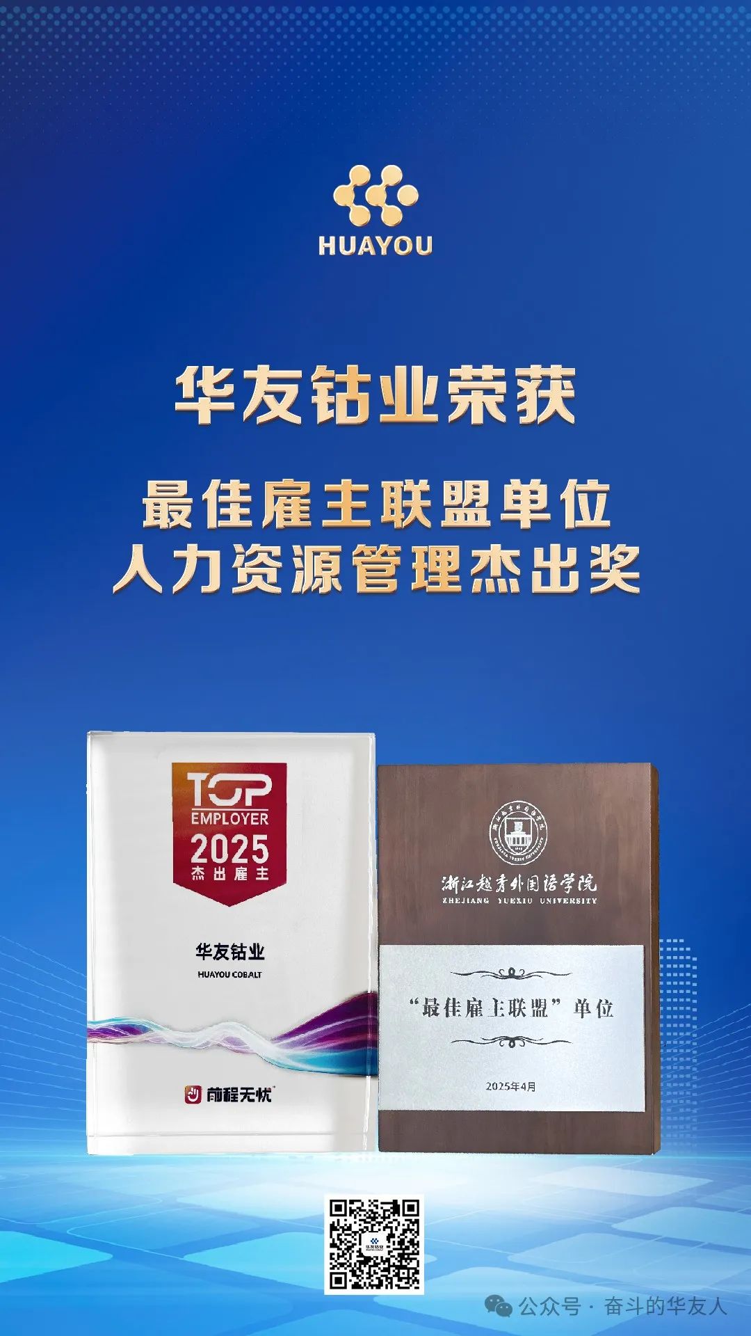 4月,華友鈷業(yè)憑借在人力資源領(lǐng)域的突破性探索與產(chǎn)教融合的標(biāo)桿實(shí)踐,蟬聯(lián)兩項(xiàng)雇主榮譽(yù)——前程無憂"2025人力資源管理杰出獎(jiǎng)"與浙江越秀外國語學(xué)院"最佳雇主聯(lián)盟"單位!這不僅是對(duì)公司“以人為本”核心價(jià)值的深度認(rèn)可,更彰顯了華友鈷業(yè)以數(shù)字化革新組織生態(tài)、以校企協(xié)同培育全球競爭力的人才戰(zhàn)略格局。