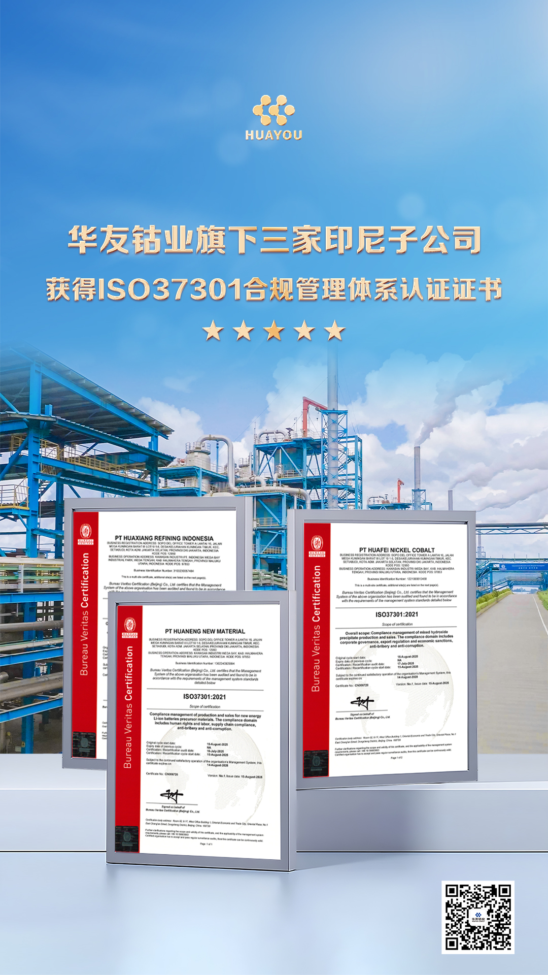 9月12日 ,華友鈷業(yè)旗下三家印尼子公司——華飛鎳鈷(印尼)有限公司、華翔精煉印尼有限公司、華能新材料有限公司正式獲得必維集團(tuán)(Bureau Veritas)頒發(fā)的ISO 37301合規(guī)管理體系認(rèn)證證書(shū)。這標(biāo)志著華友鈷業(yè)印尼新能源鋰電材料一體化產(chǎn)業(yè)基地全面接軌國(guó)際合規(guī)標(biāo)準(zhǔn),為全球化發(fā)展奠定了堅(jiān)實(shí)基礎(chǔ)。