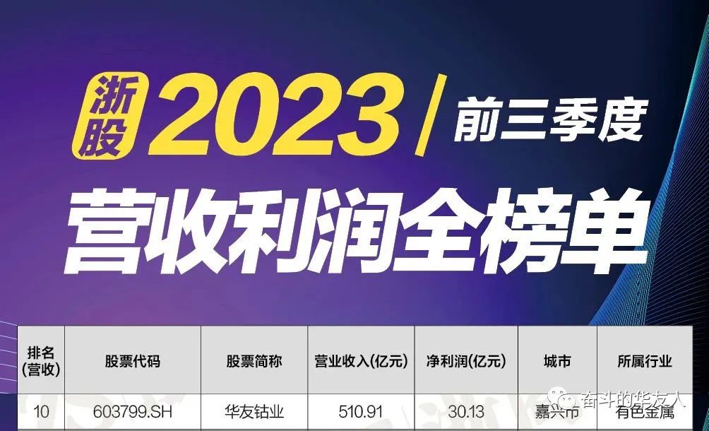 11月1日,浙商雜志公布浙江A股上市公司2023年前三季度營收、利潤全榜單,共有691家公司上榜。華友鈷業(yè)以510.91億元的營收、30.13億元的凈利潤雙雙位居第十,交上了一份高水平開放引領高質量發(fā)展的高分答卷!