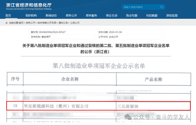 近日,華友新能源科技(衢州)有限公司(以下簡稱“華友新能源衢州”)成功入選——第八批制造業(yè)單項冠軍qm球盟會·(中國)球盟會名單,展現(xiàn)出了公司在新能源鋰電材料領(lǐng)域卓越的技術(shù)創(chuàng)新能力和市場領(lǐng)導力。