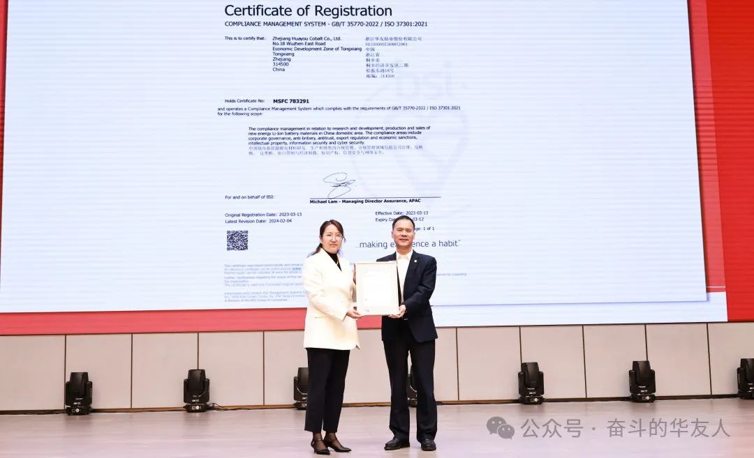 英國標(biāo)準(zhǔn)協(xié)會(huì)BSI 大中華區(qū)可持續(xù)發(fā)展總監(jiān)楊曉曼女士,BSI中國區(qū)戰(zhàn)略業(yè)務(wù)發(fā)展總監(jiān)郭玥婷女士分別為華友頒發(fā)ISO37001反賄賂合規(guī)管理體系初次認(rèn)證及ISO37301合規(guī)管理體系擴(kuò)證證書,集團(tuán)總裁陳紅良代表公司上臺(tái)接受證書。