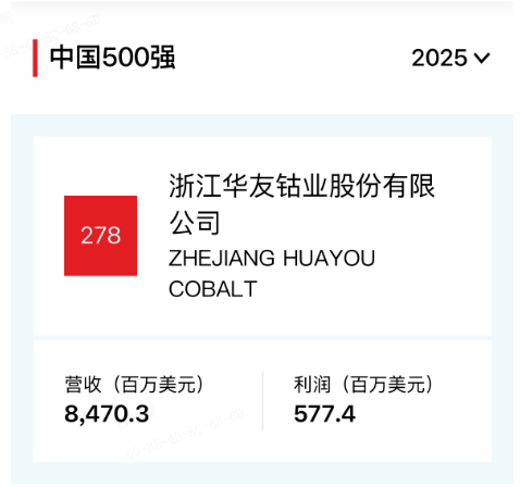 上升!華友鈷業(yè)榮登2025年《財(cái)富》中國500強(qiáng)第278位